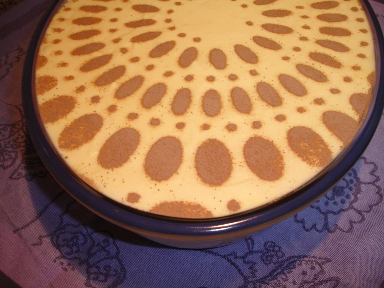 5. Na travessa em que se vai servir o doce, colocar uma camada de palitos La Reine previamente embebidos em café. Cobrir com metade do creme. Fazer outra camada com palitos embebidos em café e cobrir com o restante creme.