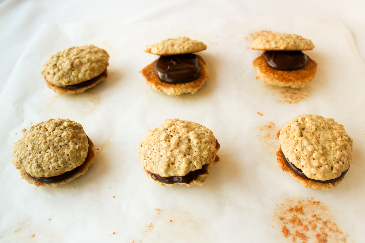 Esta manhã cheguei à cozinha sem muito tempo, mas com vontade de experimentar algo novo. As whoopie pies são algo tipicamente americano, e caracterizam-se por serem duas bolachas macias, a meio caminho entre o bolo e o biscoito, recheadas de forma abusiva com um recheio saboroso. O resultado... bolachas de aveia macias e que se desfazem a cada dentada e um recheio de chocolate que apetece comer à colherada.