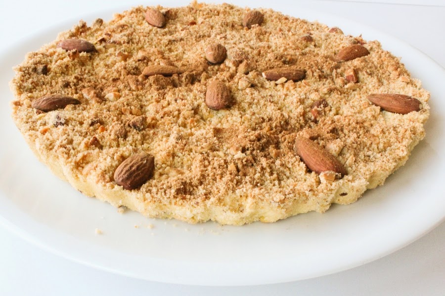 1. Colocar todos os ingredientes num recipiente grande e misturar sem amassar completamente. A mistura deve ficar semelhante a areia grossa.
