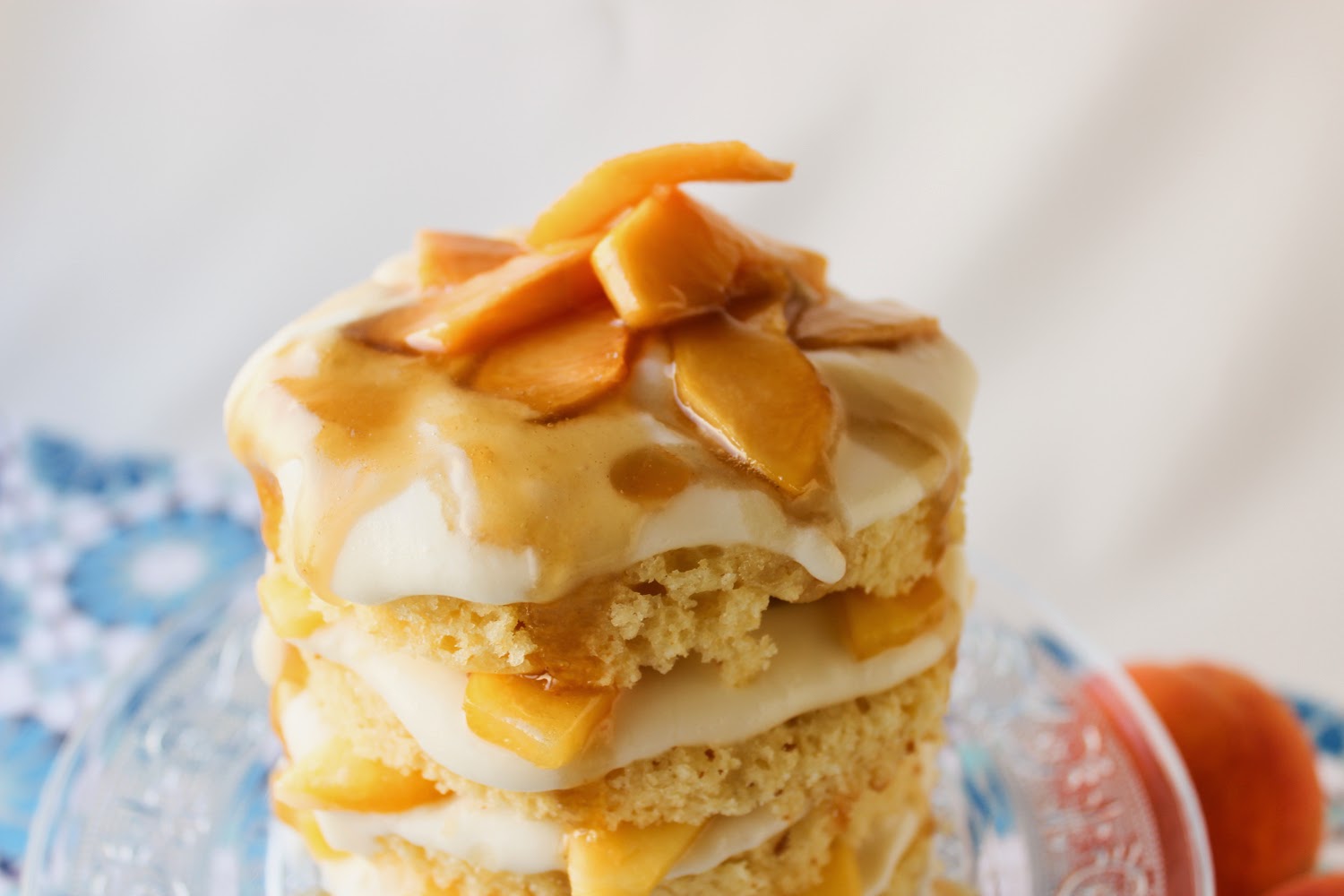 A minha proposta é um bolo de iogurte e maracujá, com um creme suave e leve de coco, acompanhado de alguns pêssegos caramelizados.