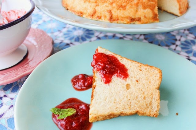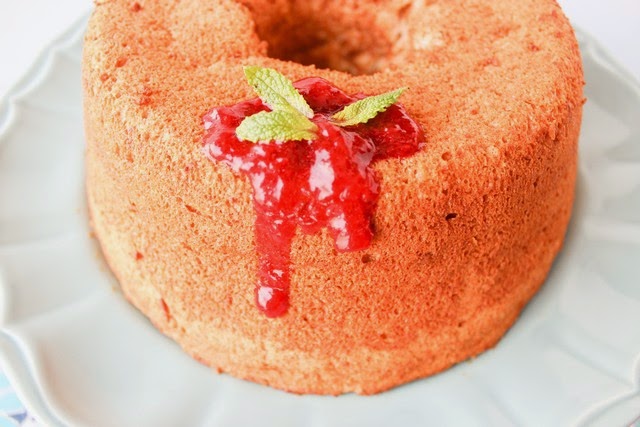 O "Angel food cake" é um bolo clássico, que sempre me impressionou. Este bolo é ideal para aproveitar claras, as quais até podem já ter estado congeladas, e oferece uma textura muito leve, próxima do Molotof.